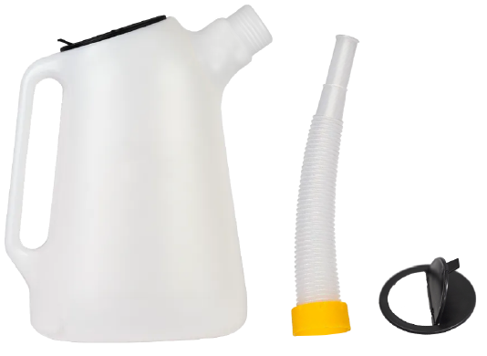 The 5-liter oil can is made of HDPE, a material resistant to acids and oils. It is comfortable to use and equipped with a flexible pouring spout and a secure closing cap.