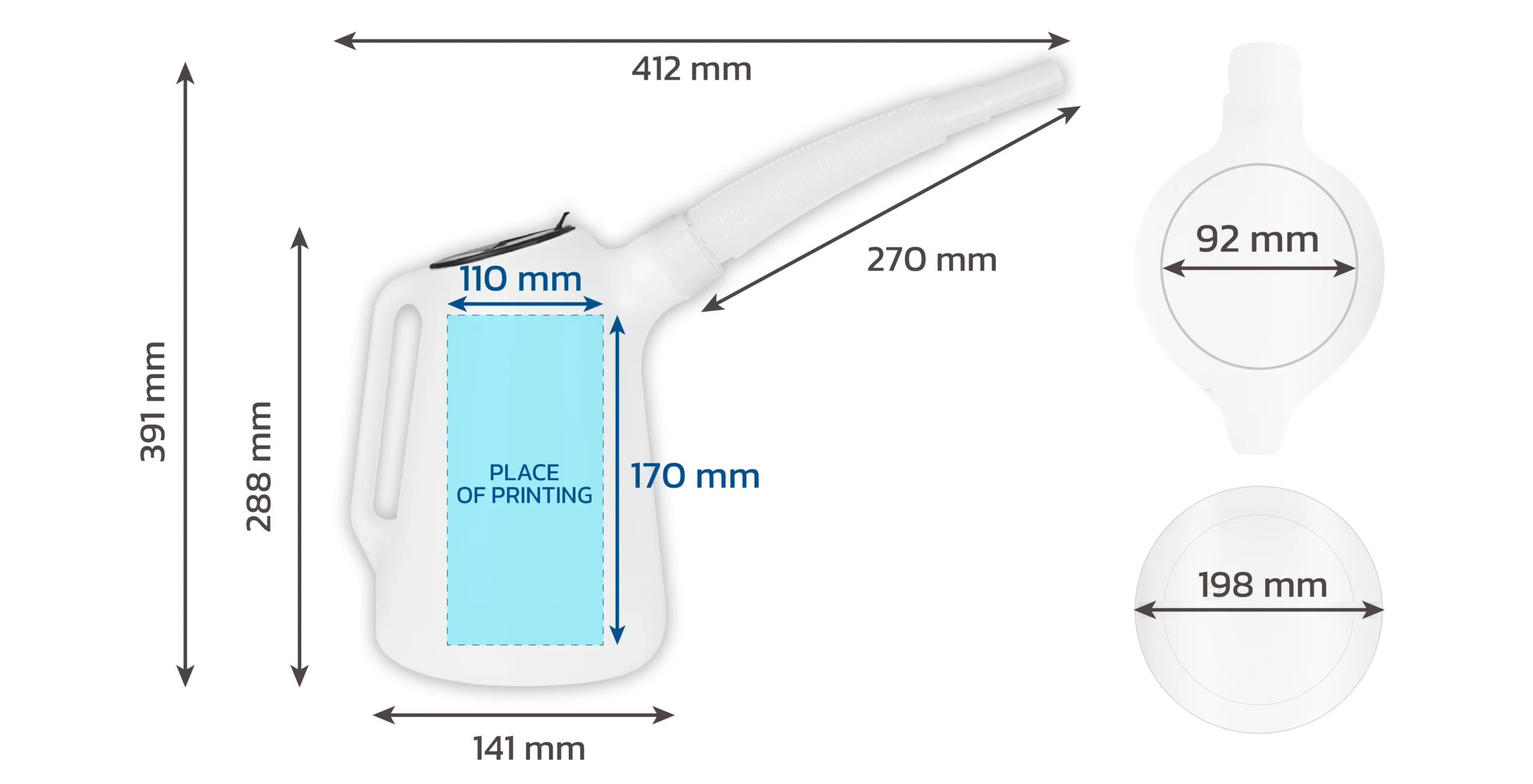 The 5 L HDPE oil jug with print is an excellent solution for storing and dispensing various liquids. Made of acid- and oil-resistant HDPE, it is suitable for use in a wide range of conditions. The embossed scale in liters and quarts makes the jug convenient to use and allows for precise measuring of liquids.